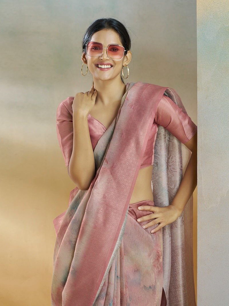 The delicate blush pink tone is enhanced with subtle, cloud-inspired tonal patterns that add depth while maintaining a refined and minimalist look. Perfect for daytime celebrations, brunch events, summer gatherings, and elegant casual occasions, this saree brings effortless sophistication without heavy embellishment.
