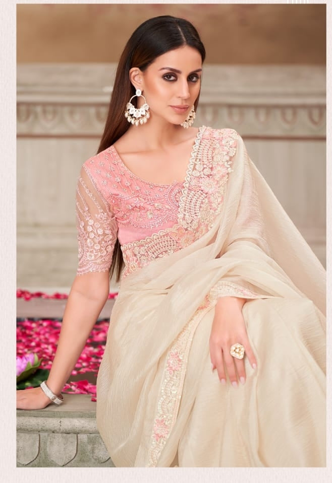 The saree is made from high-quality fabric that offers a smooth drape, lightweight comfort, and a rich finish suitable for extended wear. The heavily embroidered blouse enhances the overall look, adding a touch of opulence while allowing custom tailoring for a perfect fit.