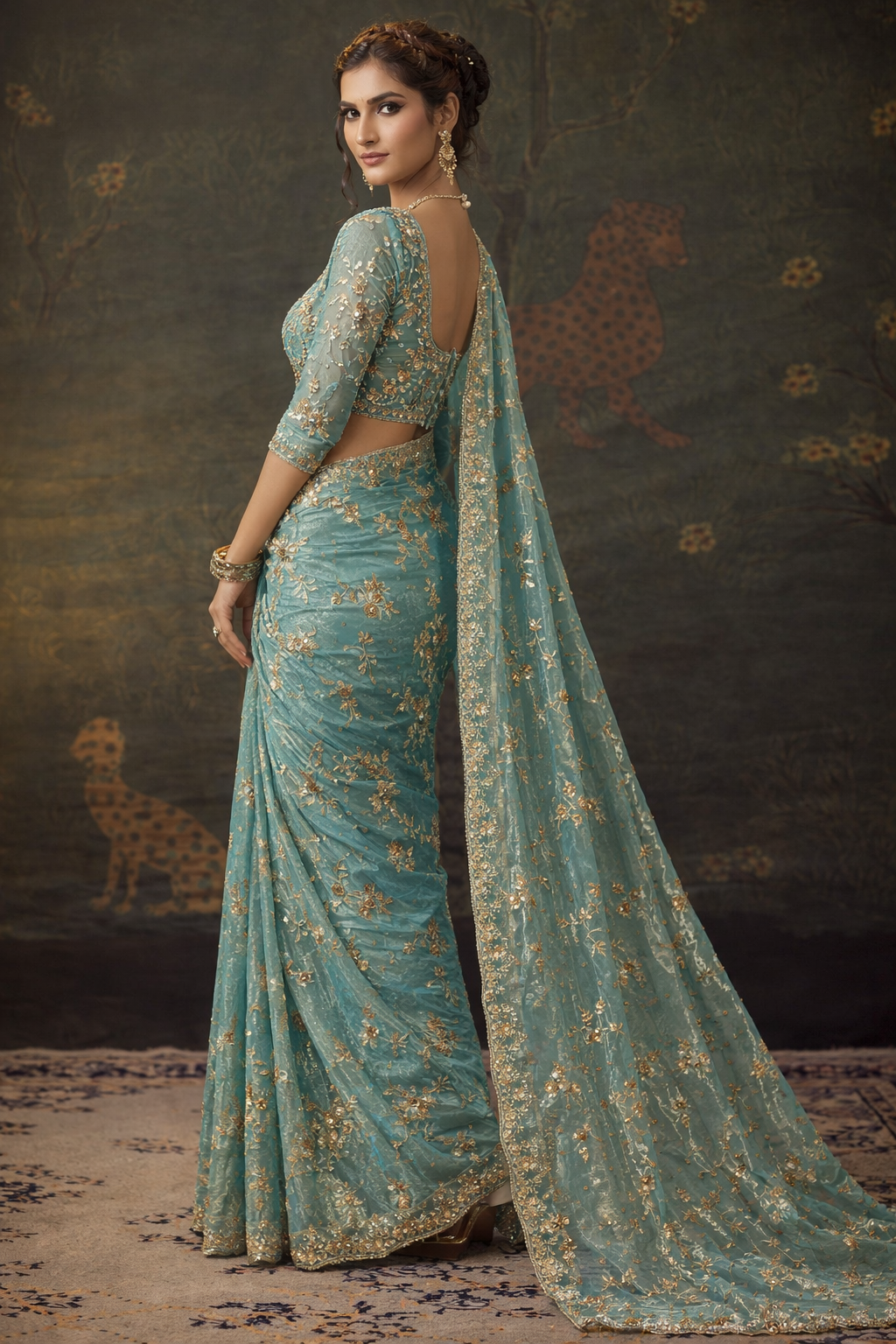 Firozi Luxury Embroidered Saree | Designer Indian Wedding Saree UK