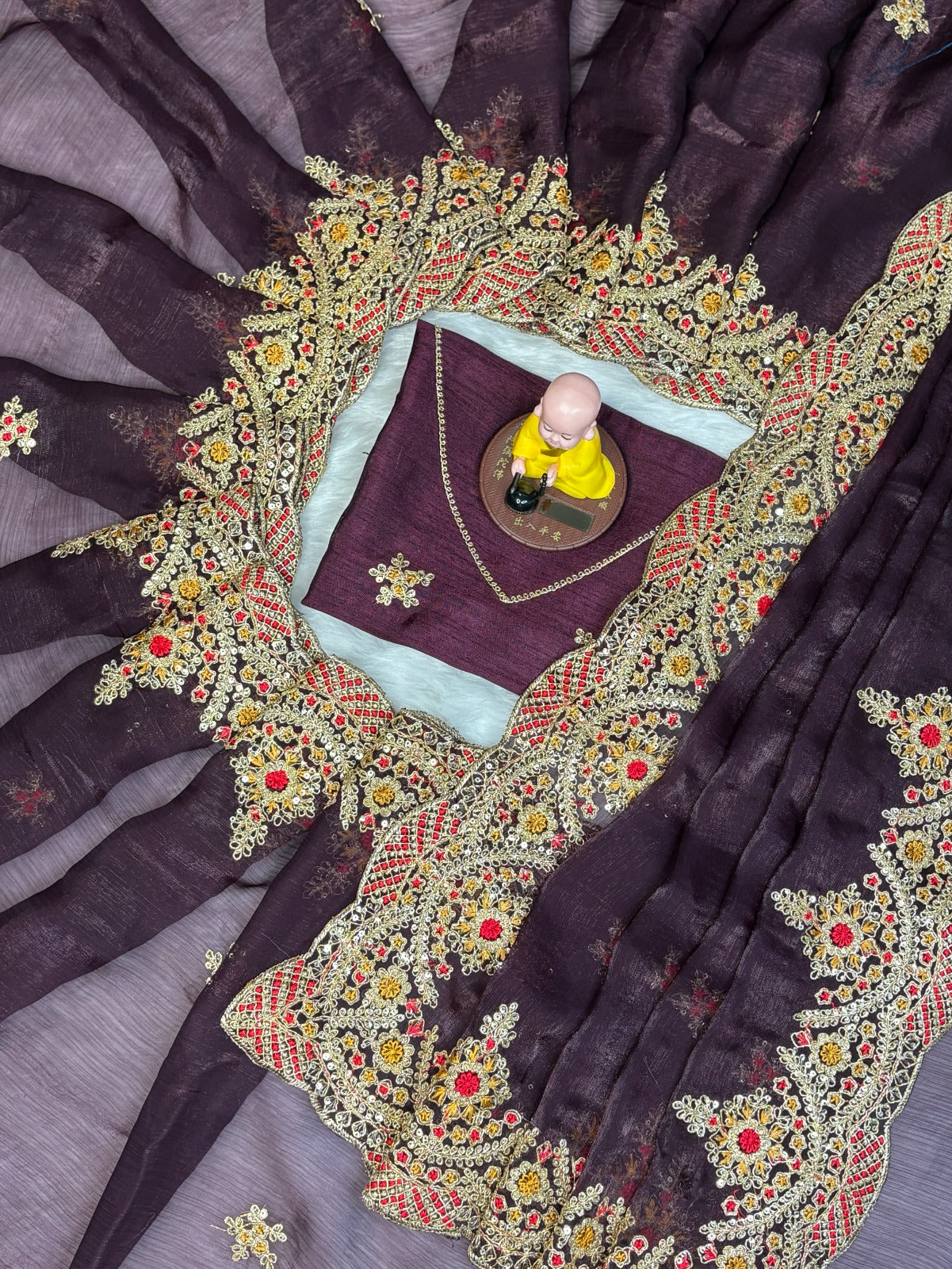 Make a refined statement with this elegant Wine embroidered designer saree, perfect for weddings, receptions, and festive occasions. Crafted from premium lightweight fabric, this saree features intricate gold and multicolour embroidery along the border and motifs across the drape, offering a timeless and graceful look.