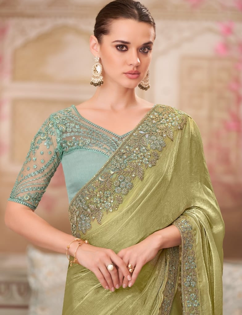 Olive Green Designer Embroidered Saree with Blouse | UK Ethnic Wear