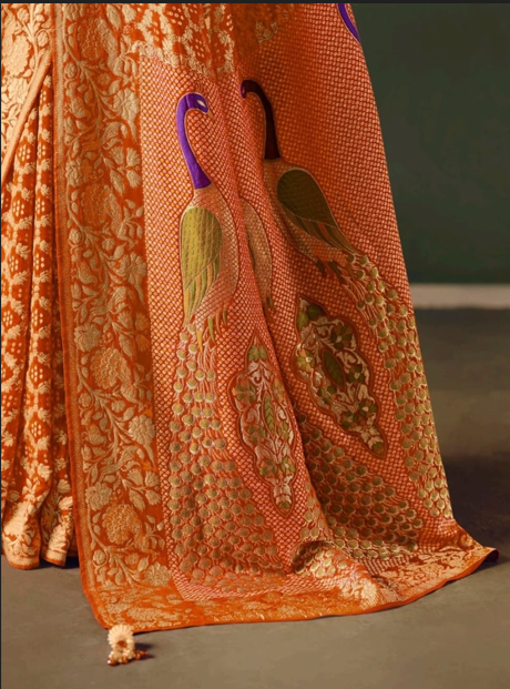 Indulge in timeless Indian elegance with this exquisite orange Banarasi silk saree, meticulously crafted with rich zari weaving and traditional motifs. Renowned for its royal heritage, Banarasi silk remains a symbol of luxury, grace, and celebration—making this saree an exceptional choice for weddings, festive occasions, receptions, and cultural events.