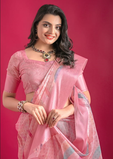 Pink Premium Printed Pure Linen Saree with Elegant Floral Design – Lightweight Party Wear Indian Saree UK