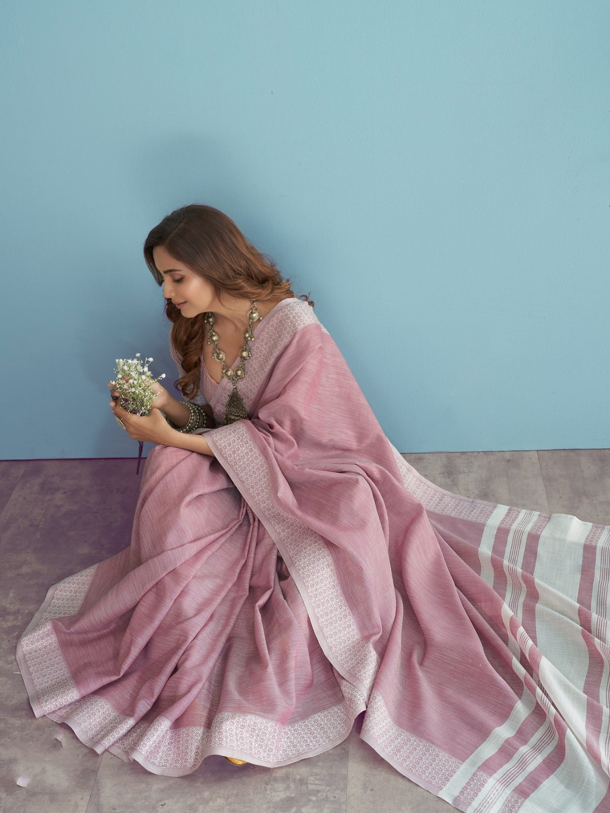 Premium Linen Cotton Pink Colour Sarees for Women | Elegant Designer Indian Sarees UK