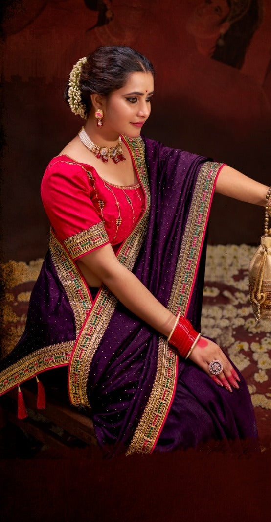 The rich Vichitra fabric offers a premium fall and subtle sheen, while the sparkling Swarovski embellishments add a touch of sophistication. The intricately woven sequin border enhances the overall look, giving you a statement outfit that stands out effortlessly.