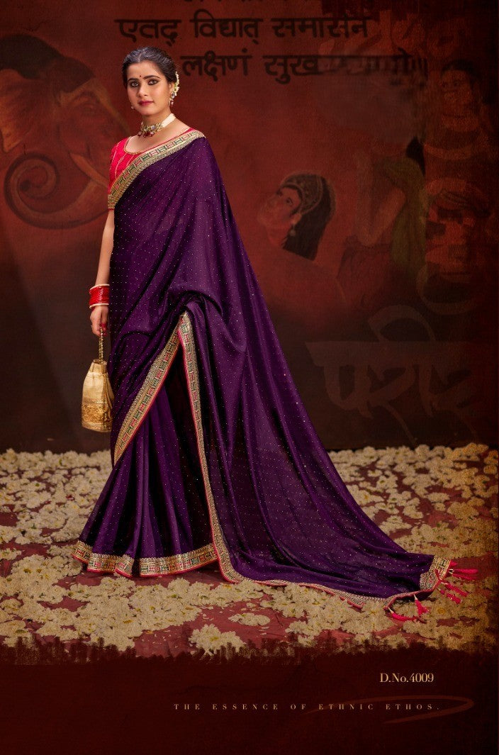 Introducing our Heavy Vichitra Saree, beautifully crafted with blooming Swarovski work and a uniquely designed sequin border.