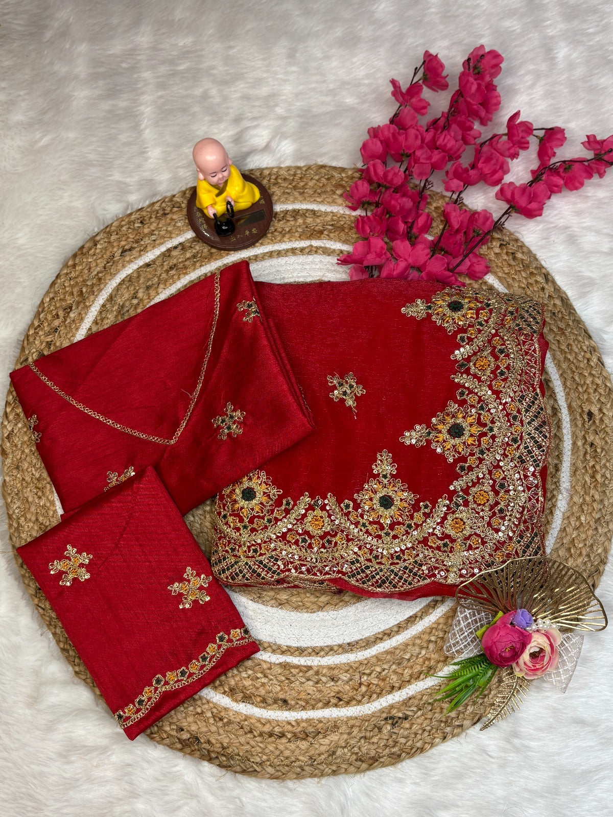 Make a refined statement with this elegant Red Embroidered designer saree, perfect for weddings, receptions, and festive occasions. Crafted from premium lightweight fabric, this saree features intricate gold and multicolour embroidery along the border and motifs across the drape, offering a timeless and graceful look.