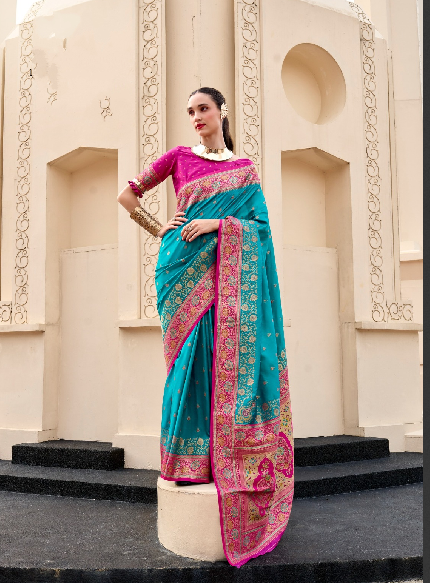 Sky Blue Banarasi Silk Saree with Zari Border | Traditional Indian Ethnic Wear