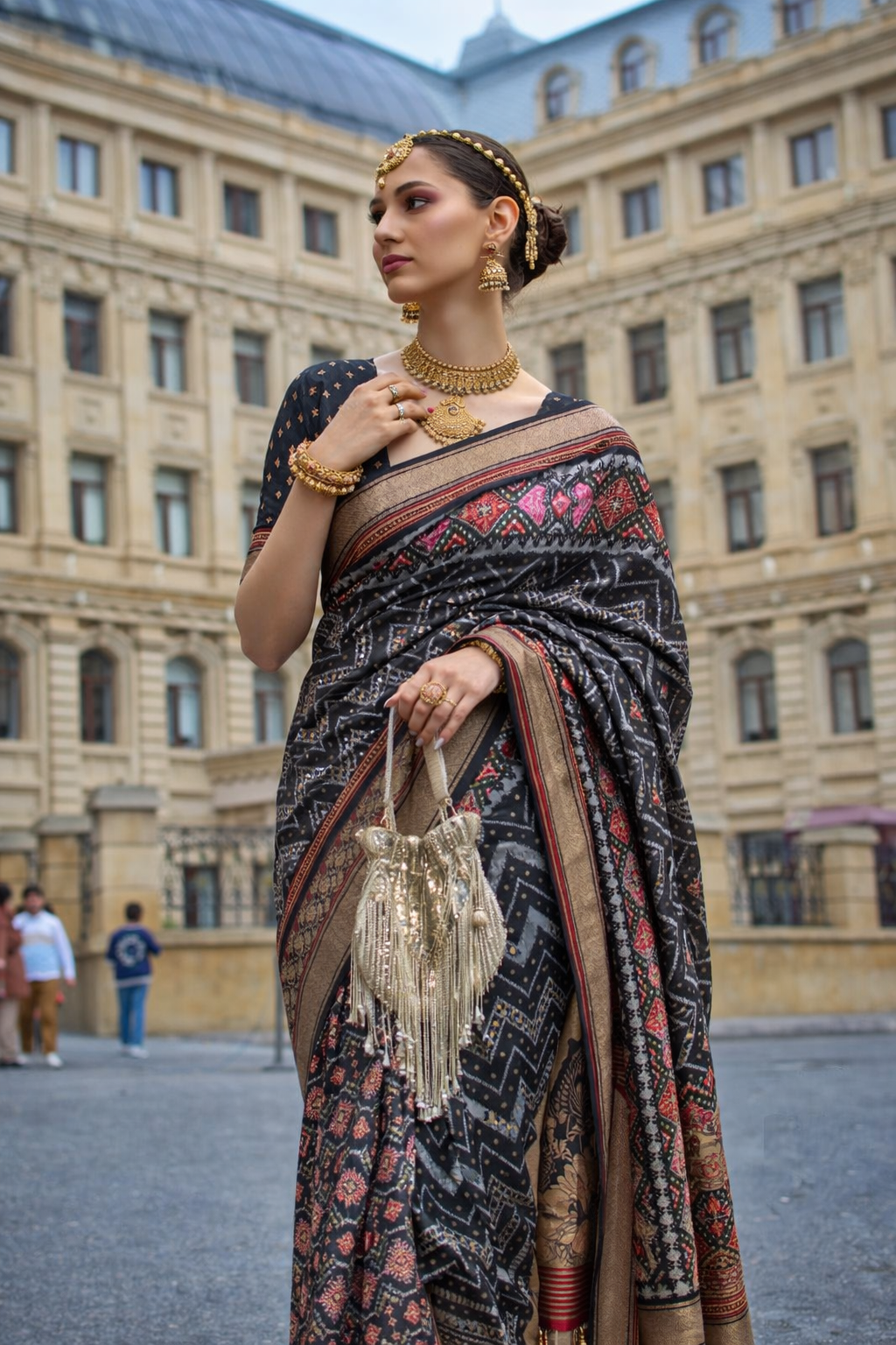 A vision of timeless sophistication, this powerful standing pose showcases the beauty of a black silk saree adorned with intricate traditional motifs in gold, pink, and ivory tones. The deep black base symbolizes strength and elegance, while the finely detailed patterns reflect centuries of artisanal craftsmanship and cultural heritage.