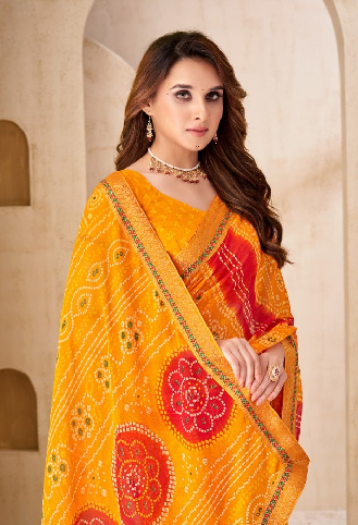 Experience the beauty of traditional craftsmanship with this premium Bandhani silk saree featuring intricate woven patterns and detailed borders inspired by Indian heritage. Designed with a graceful drape and rich artisanal detailing, this saree is ideal for weddings, festive celebrations, cultural gatherings, and special occasions. Paired with a matching blouse and classic jewelry, it reflects timeless elegance and refined ethnic style. A perfect choice for women seeking luxurious traditional attire that blends heritage artistry with contemporary sophistication.